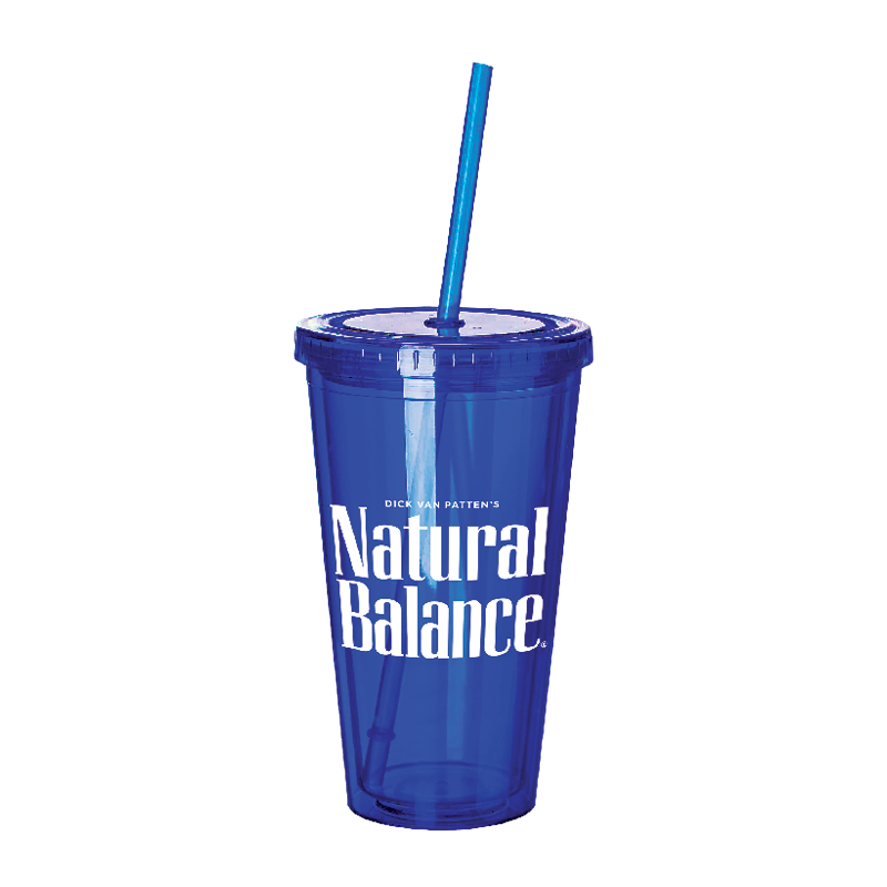 Natural Balance logo plastic travel cup with screw-on lid and reusable straw.